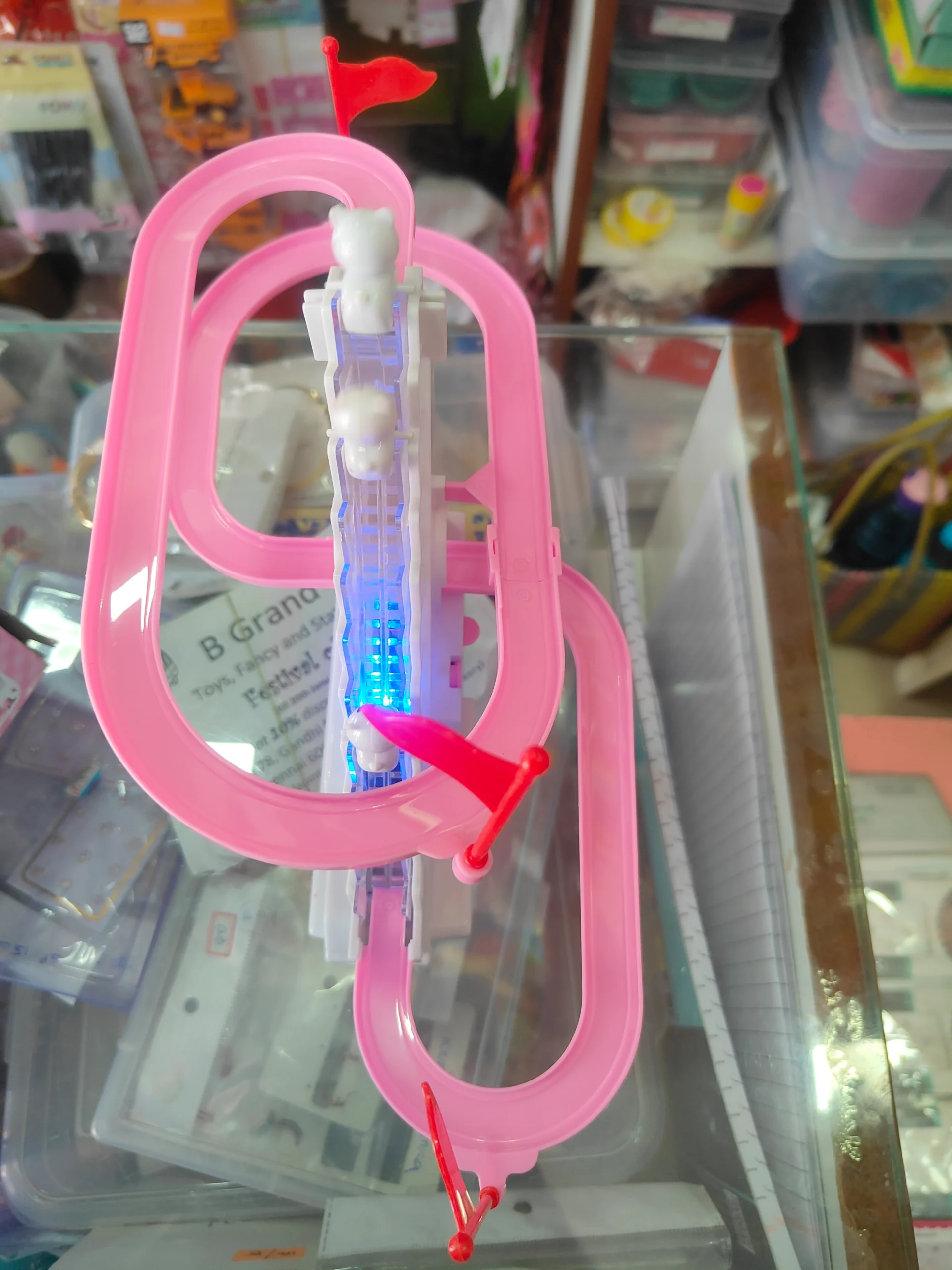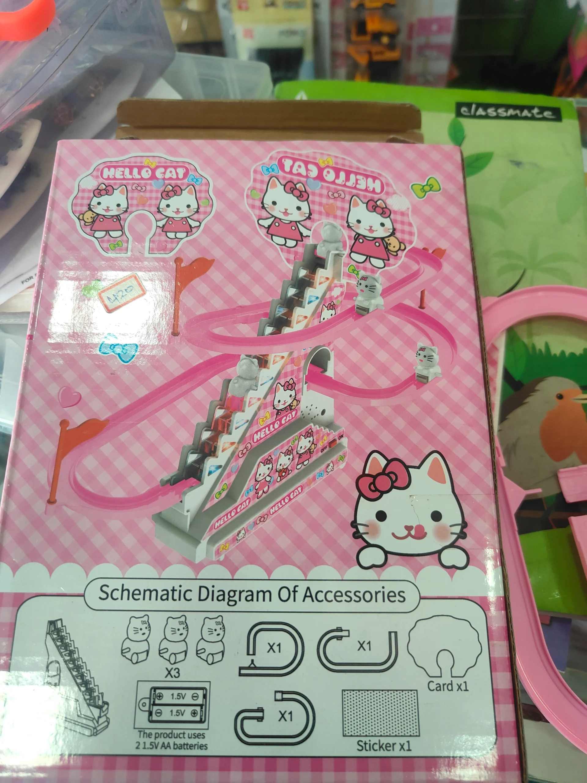 Watch your little ones giggle with delight with our Super Cute Poonakutti (Hellokitty) Track Set ✨ Features: 😻 Interactive Toy with Lights and Music : Toy is equipped with a stair climbing mechanism, allowing kitties to climb up the stairs effortlessly 😻 Easy assembly : Setting up the track is a breeze, ensuring you can start the fun in no time. Easy to store and can carry everywhere with ease 😻 Recommended for 3+ years 😻 Pack includes 3 pieces of track and 2 Hellokitty dolls 😻 High quality Plastic Material. 2 AA batteries required (not included)